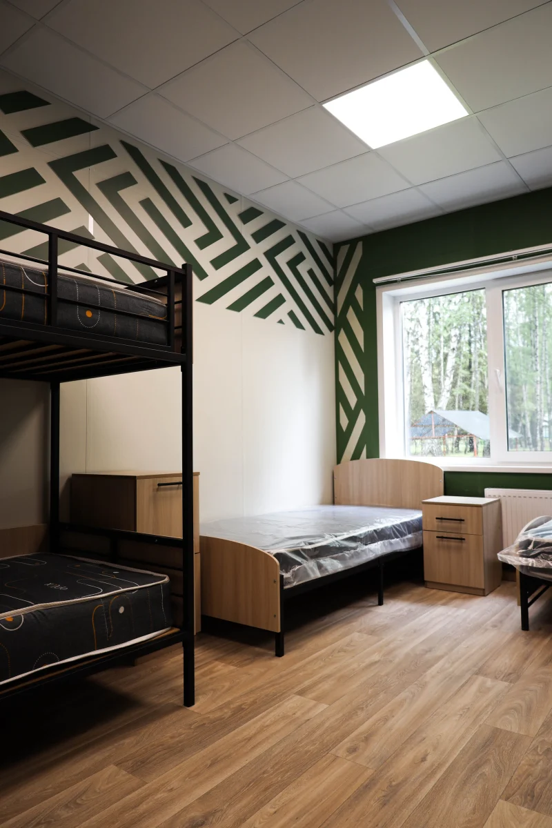 Уют и энергия: проект для лагеря «Чайка» Комплексное оснащение детского оздоровительного лагеря «Чайка». Мебель для спальных корпусов, столовой и клубной зоны — прочные кровати, тумбы, столы и стулья для активной эксплуатации.