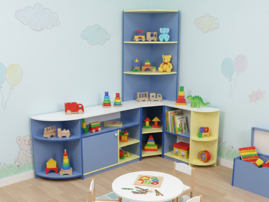 Детские стенки для удобного хранения игрушек и вещей. Помогают создать игровые зоны и рационально использовать пространство группы.